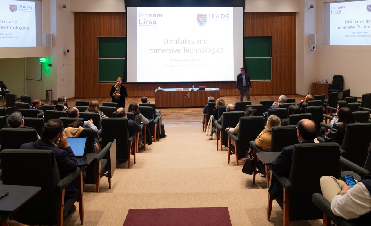 El pasado 6 de febrero, más de 70 miembros de la comunidad IPADE se dieron cita en la sede Ciudad de México para atender la sesión “Distillates and Immersive Technologies, Cases of Illustration, Experimentation and Business Opportunities”, en la cual participaron el profesor Stéphane Bourliataux-Lajoinie, profesor de Marketing digital del Conservatoire National des Arts et Métiers (CNAM, Francia) y la profesora Silvia Cacho-Elizondo, directora del área de Comercialización en IPADE Business School.
